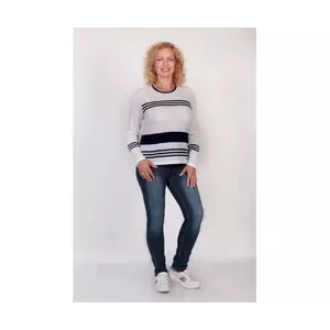 Женский джемпер белого цвета с полосками темно-синего цвета с круглым вырезом горловины. Производство Украина. Благодаря шерстяной нити (состав: 50% шерсть, 50% акрил), изделие очень теплое, комфортное и приятное к телу. Джемпер в полоску ТМ NITA согреет вас даже в самые холодные зимние.