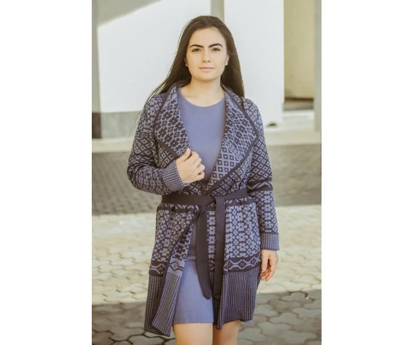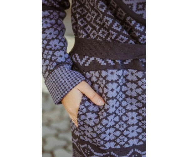 Графитово-сиреневый жаккардовый кардиган с карманами и поясом.