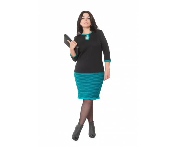 Элегантное женственное платье Л 699-19 с пикантной "капелькой" в области декольте и рукавом 3/4. Универсальный вариант на весну и осень. Платье выполнено из качественного полушерстяного полотна комбинированных цветов - черного с бирюзовым.