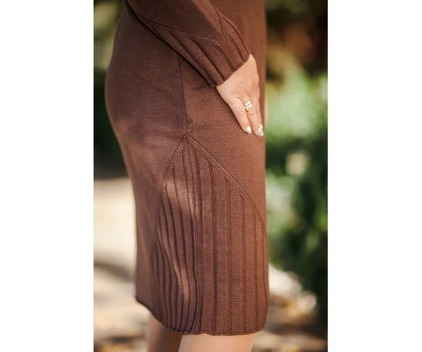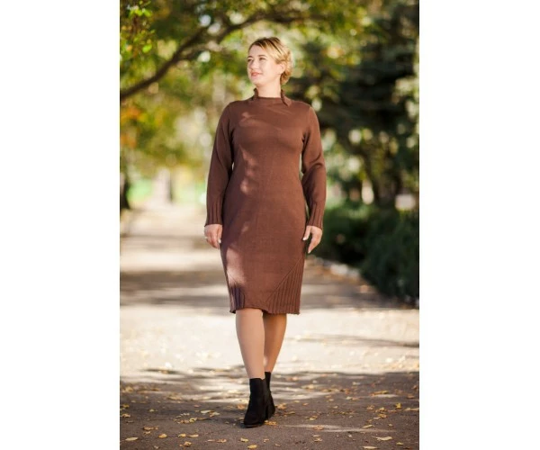 Очень теплое однотонное платье, выполненное из полушерсти. Ворот-стойка в нестандартном виде придаст уникальности данной модели, а также разная вязка на основной части платья, на рукавах и по бокам.