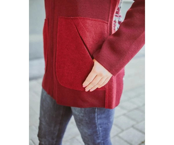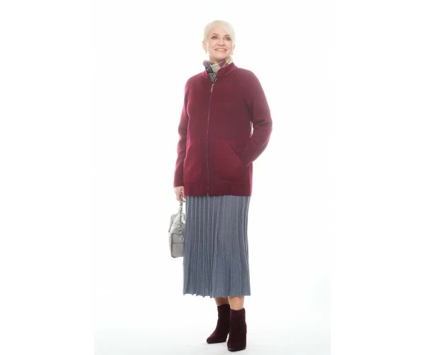Вязаный жакет на молнии, комбинированный с буклированным фетром. Спинка жакета оформлена жаккардовым рисунком авторской разработки, а также большими накладными карманами из букле (ворот-стойка из этого же полотна). Особого внимания заслуживает высококачественная фурнитура. Модель одинаково органично смотрится на представительницах прекрасной половины любого возраста и комплекции.