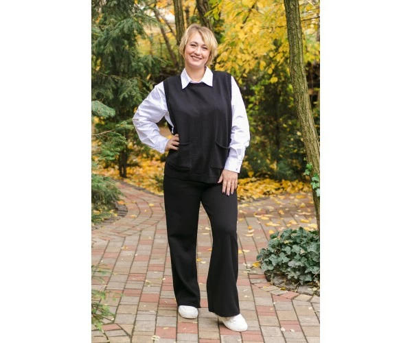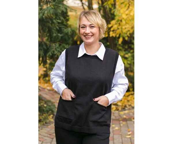 Стильный и практичный жилет, идеален для теплого и холодного времени года. Подойдет к юбке, брюкам, кюлотам и джинсам.